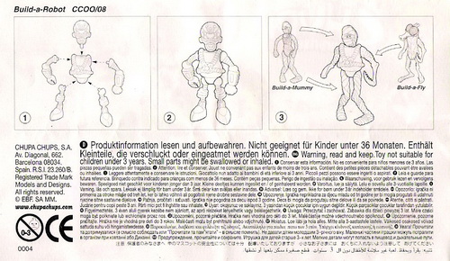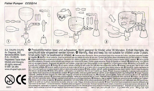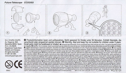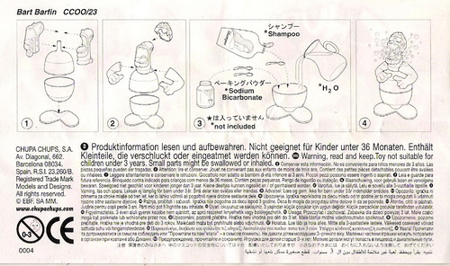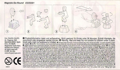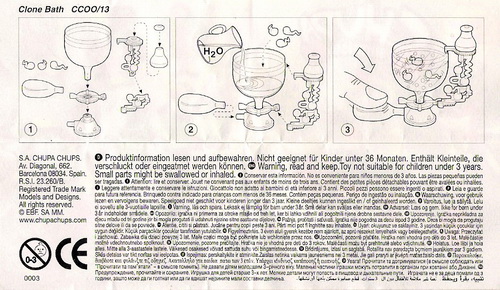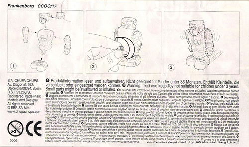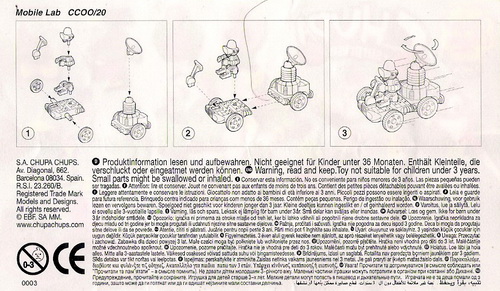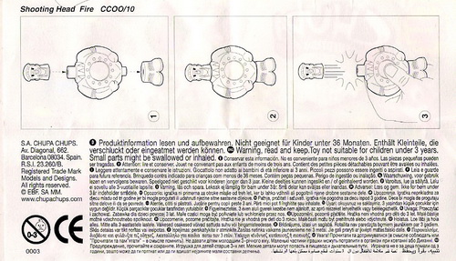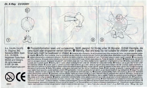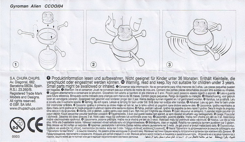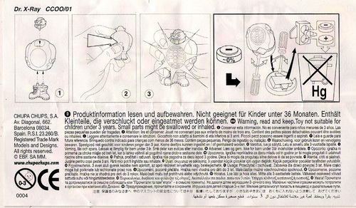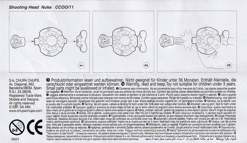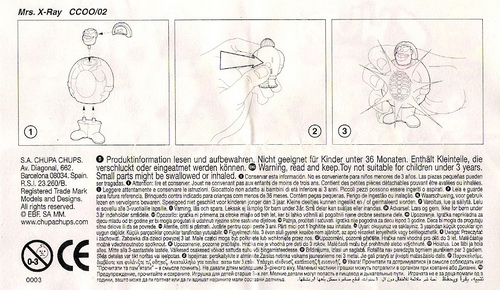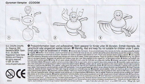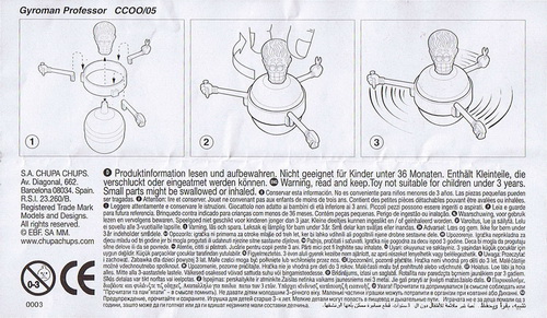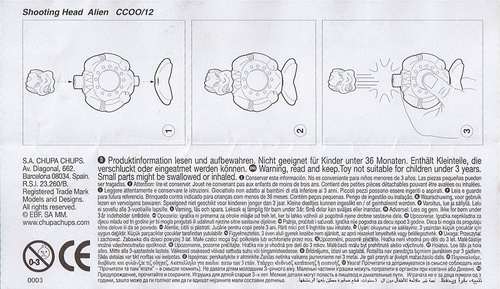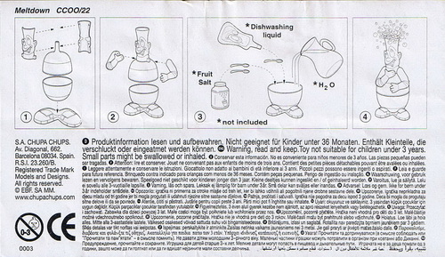 Verschiedene Versionen der BPZ-Rückseite bekannt: V1= Adresse S.A. CHUPA CHUPS, Nummer unter dem Warnkreis 003 V2= Adresse CHUPA CHUPS S.A., Nummer unter dem Warnkreis 004 |
