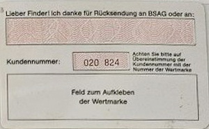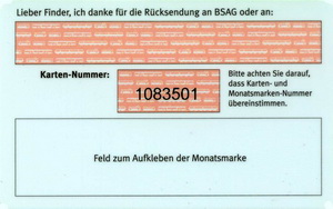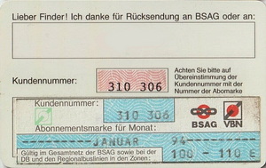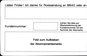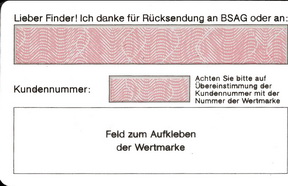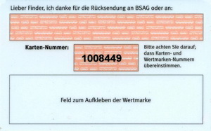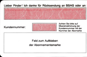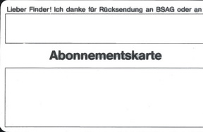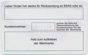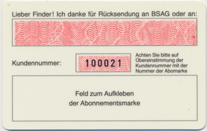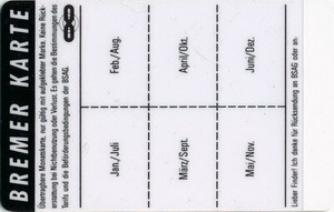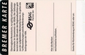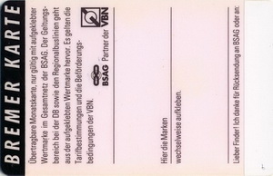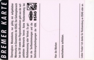 Die 2er Rückseite (ohne Schutzgebühr) RS weiß Text 7-zeilig, größerer Schrift Logo: liegende 8/ BSAG/ VBN (RS-2-1) |