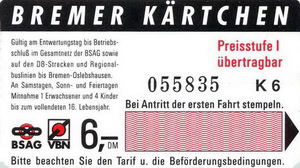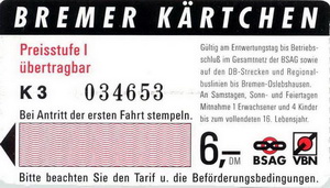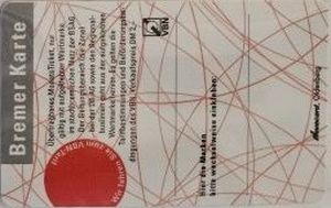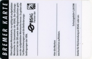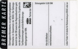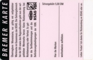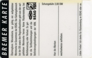 Die 2er Rückseite (Schutzgebühr 5,00 DM) RS weiß "Schutzgebühr 5,00 DM" waagerecht, unten Text 6-zeilig, kleine Schrift Logo: Kreis-Logo/ BSAG/ Partner der VBN Logo klein, Bremer Karte groß (RS-2.5-4v) |