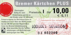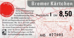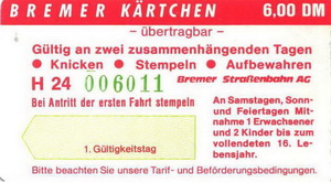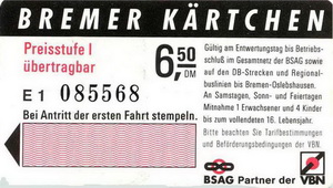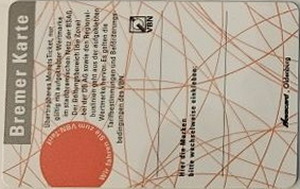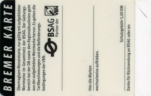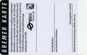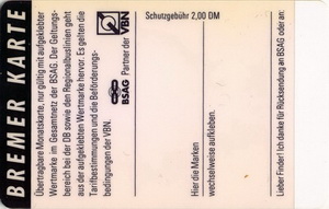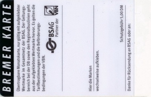 Die 2er Rückseite (Schutzgebühr 5,00 DM) RS weiß "Schutzgebühr 5,00 DM" waagerecht, unten Text 6-zeilig, kleine Schrift Logo: Kreis-Logo/ BSAG/ Partner der VBN Logo klein, Bremer Karte klein (RS-2.5-4) |