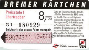 Die 2er Rückseite (Schutzgebühr 2,00 DM) RS weiß "Schutzgebühr 2,00 DM" hochkant, rechts Text 6-zeilig, normale Schrift Logo: liegende Acht/ BSAG/ Partner der VBN (RS-2.2-2) |