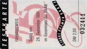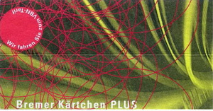 Das "Bremer Kärtchen" ist ein 2-Tage Ticket. Es galt zunächst am Entwertungstag sowie am darauf folgenden Tag bis zum Betriebsschluss im Gesamtnetz der BSAG. Ab dem 01.Juli 1992 galt das Bremer Kärtchen nur noch am Entwertungstag bis zum Betriebsschluss. | |||||||||||